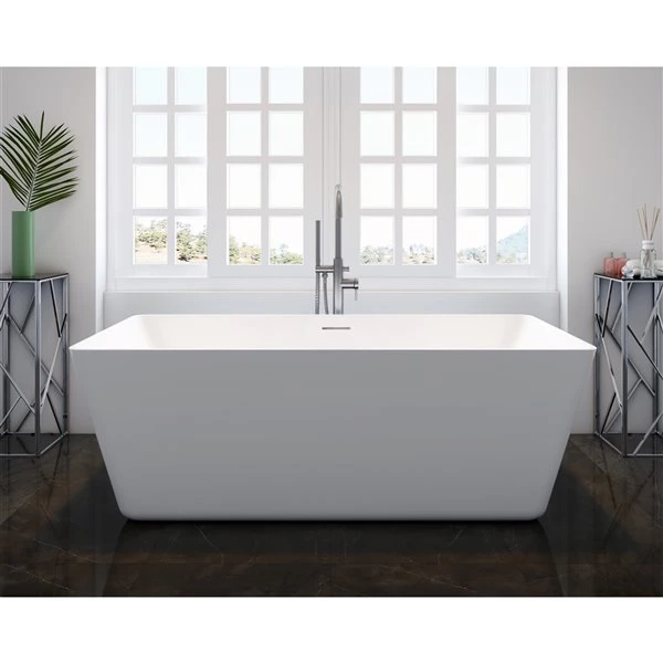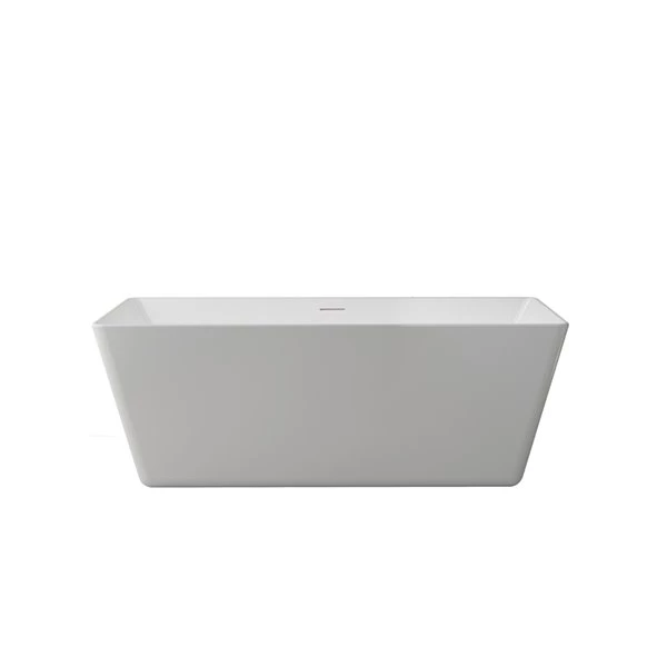 The sleek and modern lines of this bathtub will be a showpiece in your bathroom. This bathtub features symmetrical backrests and an integrated overflow. This free-standing bathtub is made of pure acrylic and easy to setup with it’s integrated leveling pads.
