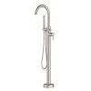 This freestanding bathroom faucet boasts a minimalist style that’s ideal for a modern master bath. A coordinating handheld showerhead mimics the industrial design of the decorative faucet with an exposed plumbing hose. A brushed nickel finish accentuates the gentle arc of the round gooseneck faucet with a shiny silver lustre that lasts.