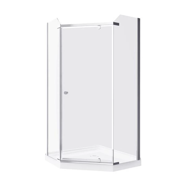 - Neo-angle shower kit includes clear glass shower door and panels, aluminum profiles, white corner shower base and shower drain