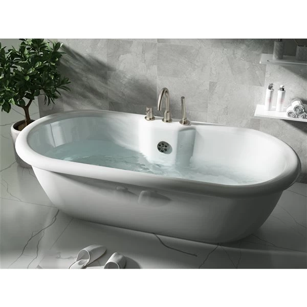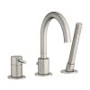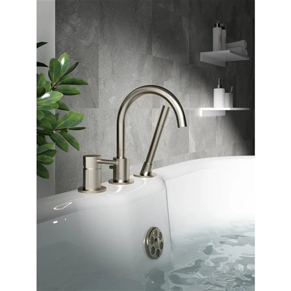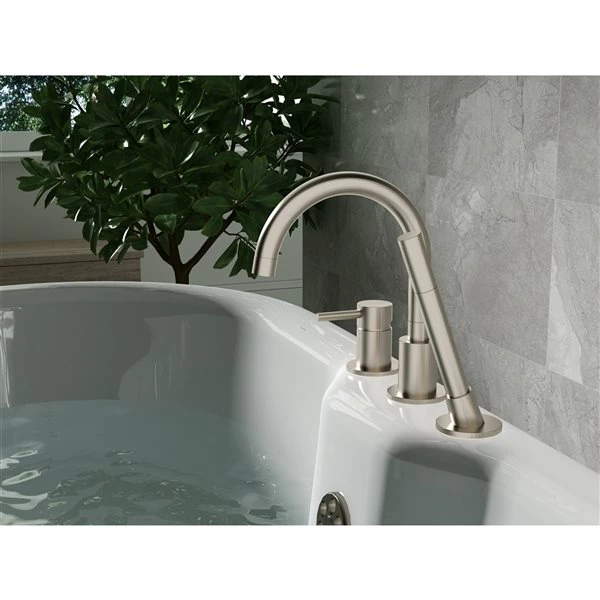 Featuring an integrated Roman-style format designed to disguise, the decorative deck-mounted faucet conceals the extended hoses for the coordinating hand shower of the bathtub basin. The single handle faucet uses a simple lever to control hot and cold temperatures, while the gentle arc of the traditional gooseneck faucet head and brass components feel fresh with a brushed nickel finish.