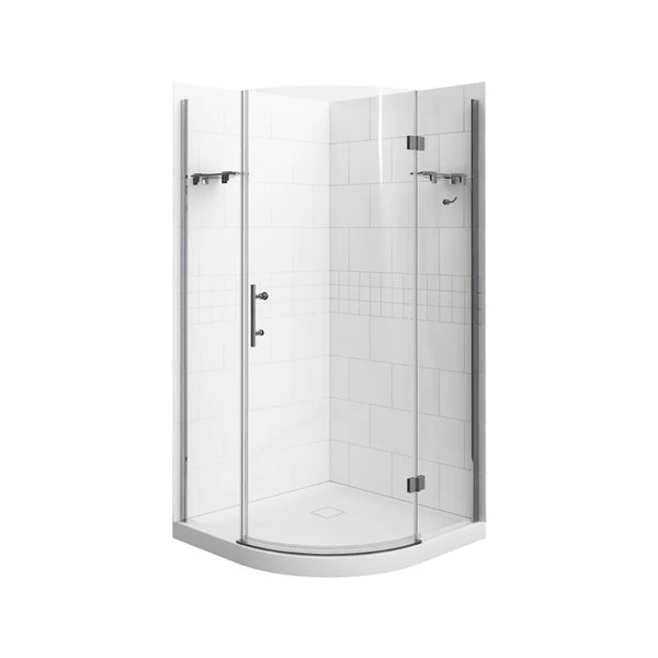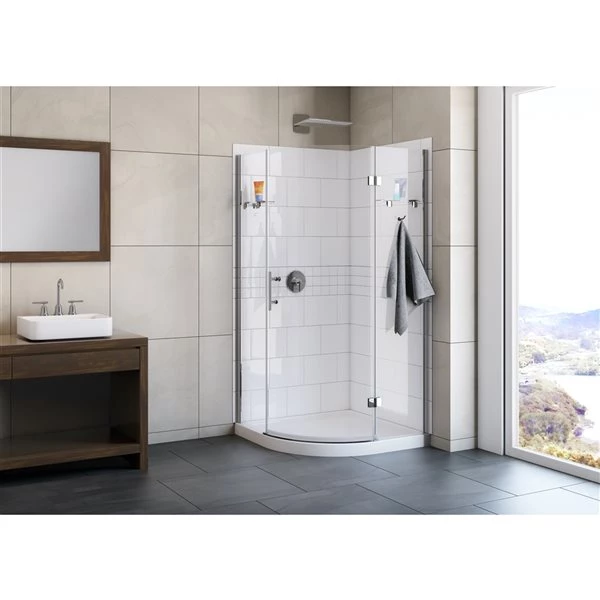 This neo-round shower kit with base maximizes space and fits in the corner of most bathrooms. The tile effect wall in white acrylic provides a trendy look to this shower. This corner installation complements most bathroom decors with style and durability.
